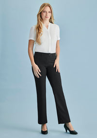 Features: A comfortable everyday pant, mid-rise waist with a waistband designed to sit just below the navel. Straight leg, front horizontal pockets with one pocket on the rear.