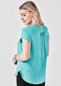 Short top in soft fabric with a square neckline and draped bodice. Long sleeves with narrow elastic at shoulders and cuffs. Lined bodice.